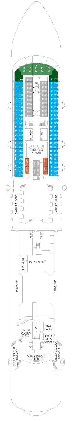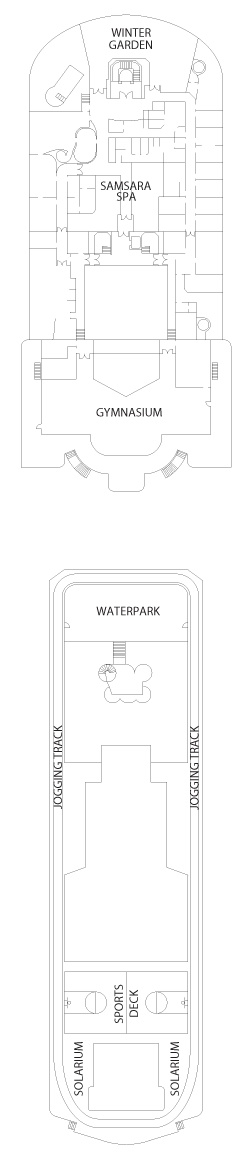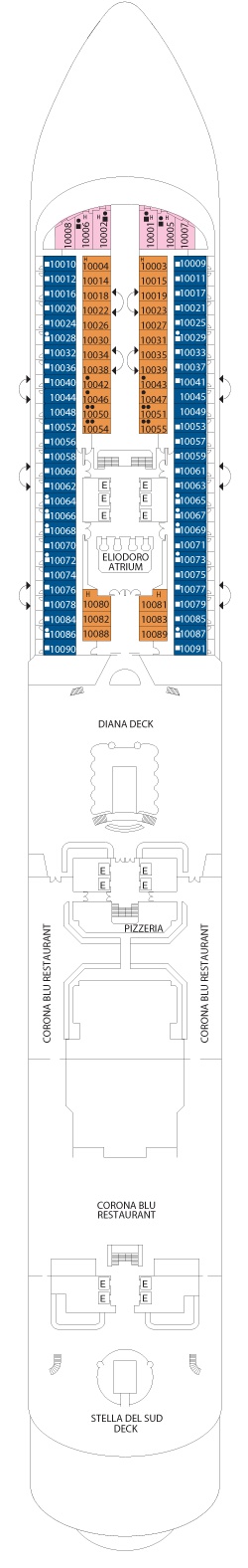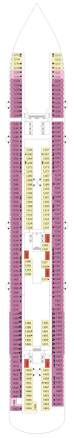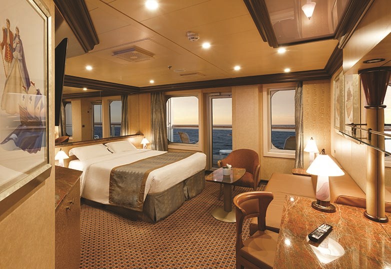 Kabin Özellikleri: Özel verandalı balkon, iki adet tek kişilik yatak veya bir büyük yatak, duşlu banyo, çalışma ve makyaj masası, kanepe ve geniş oturma alanı. Her kamara da uydu ile interaktif televizyon vardır, klima, direkt telefon, saç kurutma makinesi, mini bar, kasa ve 24 saat oda servisi bulunmaktadır. Balkonlu premium kabinler geminin üst katlarında bulunmaktadır.