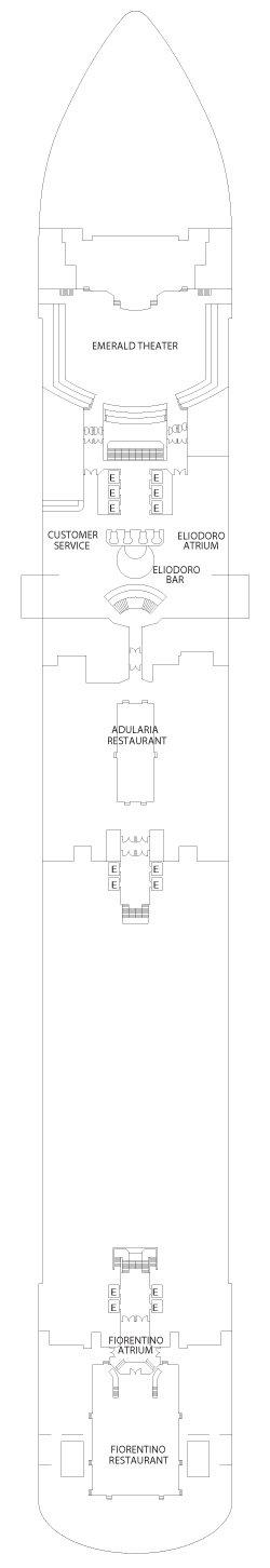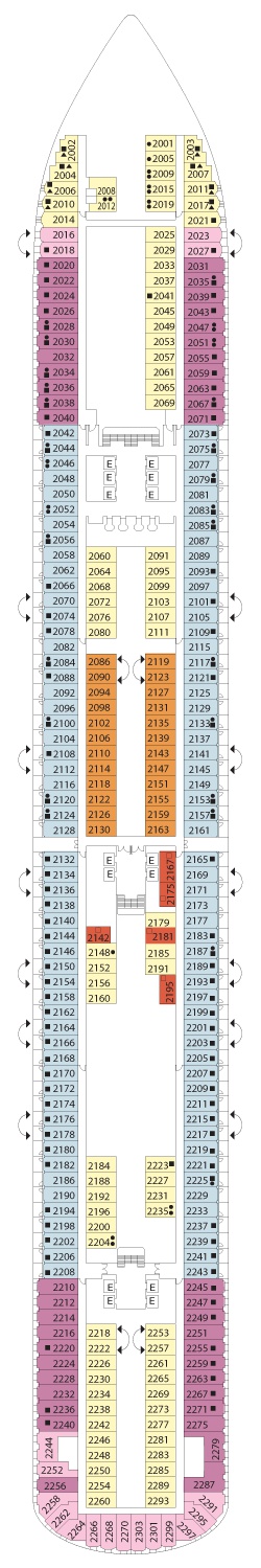 Kabin Özellikleri: İki adet tek kişilik yatak veya bir büyük yatak, duş, telefon, televizyon, saç kurutma makinesi, kasa ve minibar. Premium kabinler geminin yüksek katlarında bulunmaktadır.