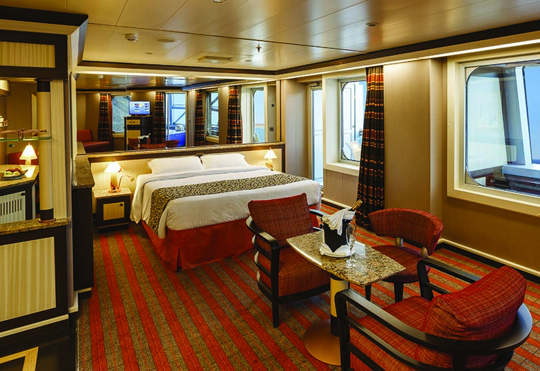Kabin Özellikleri: Özel verandalı büyük balkon, iki adet tek kişilik yatak veya tek büyük yatak, bir kanepe, dolap, jakuzili ve duşlu banyo, çalışma ve makyaj masası, her kamara da uydu ile interaktif televizyon vardır, klima, direkt telefon, saç kurutma makinesi, mini bar, kasa bulunmaktadır. Öncelikli check-in işlemleri, köpüklü şarap, soğuk kanepeler ve taze meyve sepeti hizmeti, a la carte restaurantta bir akşam yemeği hizmeti verilmektedir. Maks. 3 kişi konaklayabilir.
