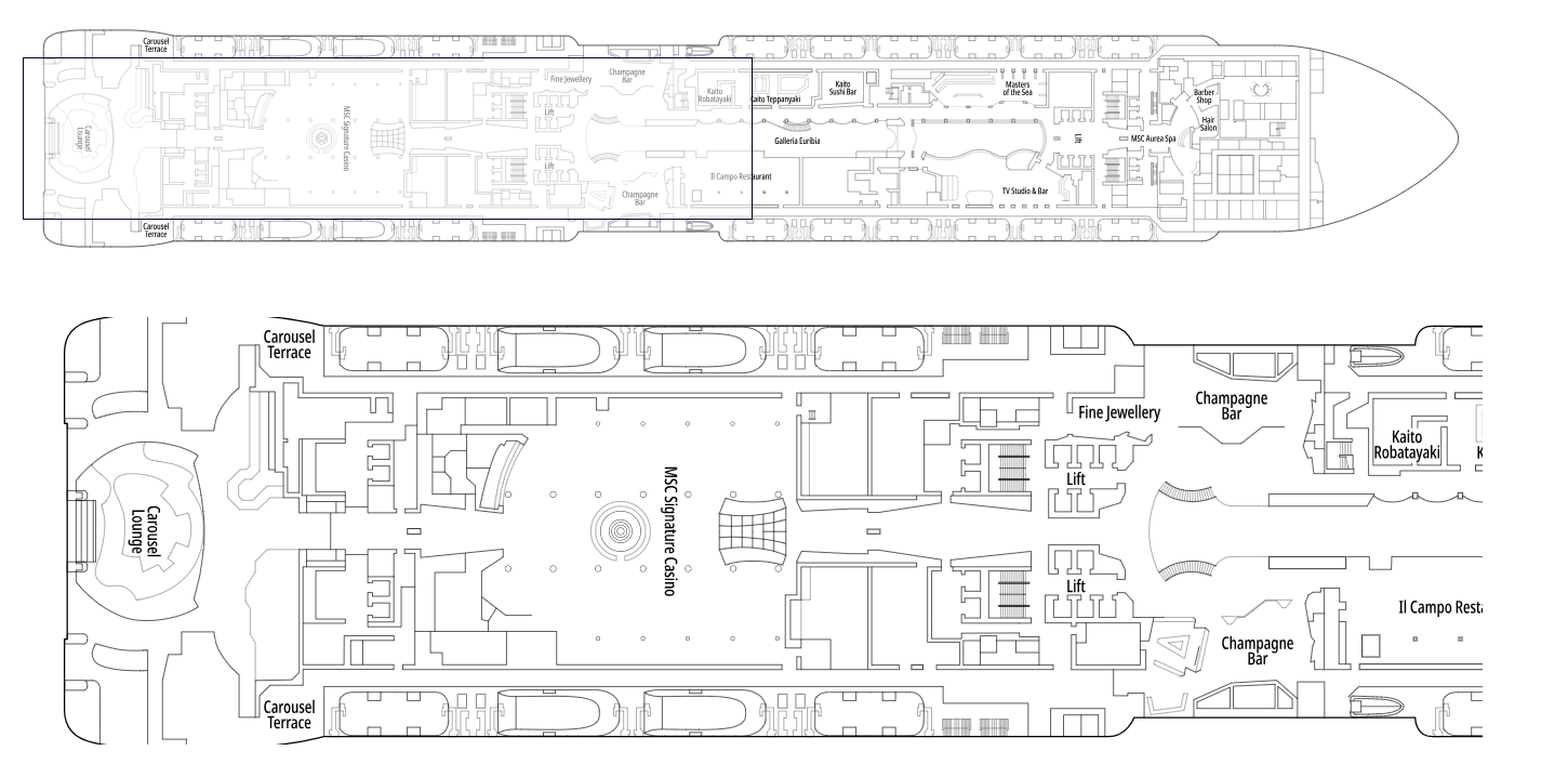 - Yüzey alanı 59 m², balkon 23 m², güverte 9-12, yemek masası ve özel jakuzili banyo - İki katlı kabin - Yacht Club alanlarına kolay erişim Ana kat: - Açık oturma/yemek odası, çift kişilik yatağa dönüşebilen kanepe - Duşlu banyo İkinci kat: - Çift kişilik yataklı master yatak odası, talep üzerine iki tek kişilik yatağa dönüştürülebilir - İki yürüyüş dolabı - Küvetli banyo - Ücretsiz Wi-Fi bağlantısı - Etkileşimli TV, telefon, kasa ve mini bar MSC Yacht Club ile ayrıcalıklar dünyasını keşfedin: - 24 Saatlik Butler hizmeti ve özel konsiyerj - Premium Ekstra İçecek ve İnternet paketleri dahil - MSC Aurea SPA’daki Termal Suite’e ücretsiz erişim - Tüm spa işlemlerinde %10 indirimli paketler - 1 Ücretsiz gemi değişikliği - Görsel sadece temsili olup; boyut, düzen ve mobilyalar (aynı kabin kategorisinde) farklılık gösterebilir.