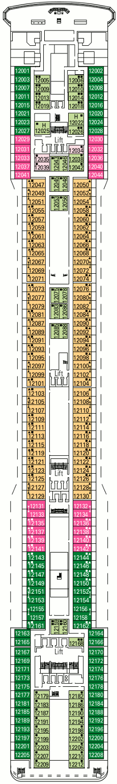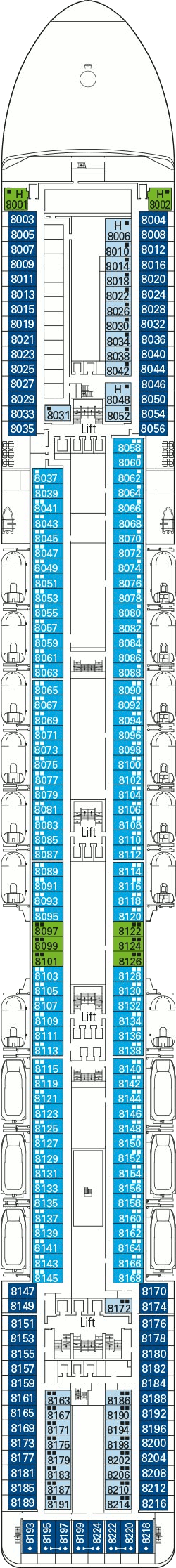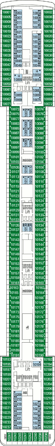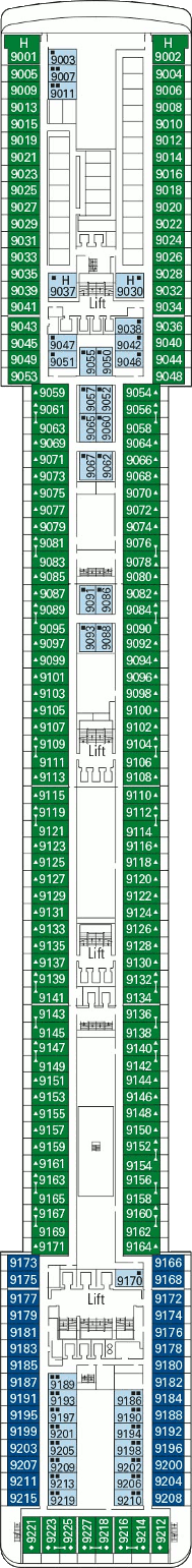 - Yüzey alanı 18 m², balkon 5 m², güverte 12 m² - Koltuklu oturma alanı - Duşlu banyo, saç kurutma makinesi bulunan makyaj alanı - Konforlu çift kişilik veya tek kişilik yataklar (isteğe bağlı*) - Etkileşimli TV, telefon, Wifi bağlantısı mevcut (ücretli), kasa ve minibar - *Engelli misafirler veya hareket kısıtlılığı olanlar için kabinlerde yalnızca tek kişilik yataklar bulunur (15025 numaralı kabin hariç) - Görsel sadece temsili olup, boyut, düzen ve mobilyalar farklılık gösterebilir (aynı kabin kategorisi içinde).