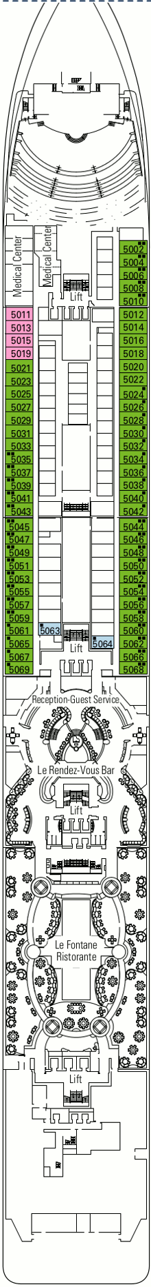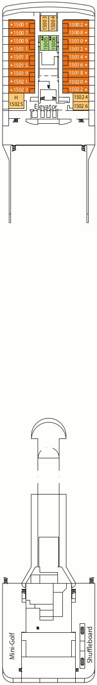 - Yüzey alanı 15 m², balkon 5 m², güverte 8-9 m² - Koltuklu oturma alanı - Duşlu banyo, saç kurutma makinesi bulunan makyaj alanı - Konforlu çift kişilik veya tek kişilik yataklar (isteğe bağlı*) - Etkileşimli TV, telefon, Wifi bağlantısı mevcut (ücretli), kasa ve minibar - *Engelli misafirler veya hareket kısıtlılığı olanlar için kabinlerde yalnızca tek kişilik yataklar bulunur (15025 numaralı kabin hariç) - Görsel sadece temsili olup, boyut, düzen ve mobilyalar farklılık gösterebilir (aynı kabin kategorisi içinde).