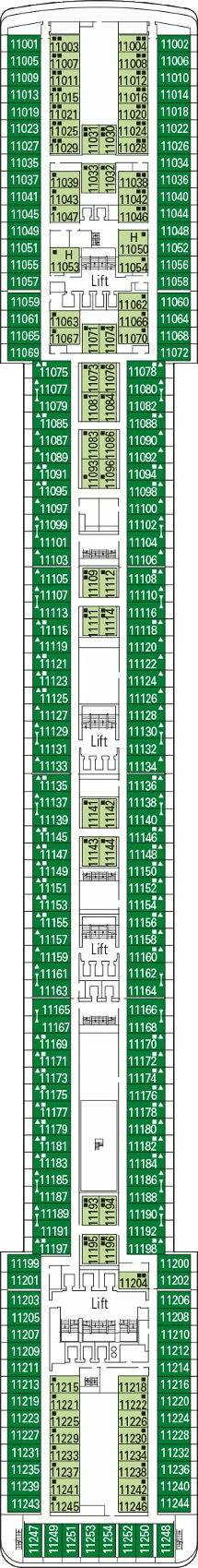 - Yüzey alanı 18 m², balkon 5 m², güverte 9-11 m² - Koltuklu oturma alanı - Duşlu banyo, saç kurutma makinesi bulunan makyaj alanı - Konforlu çift kişilik veya tek kişilik yataklar (isteğe bağlı*) - Etkileşimli TV, telefon, Wifi bağlantısı mevcut (ücretli), kasa ve minibar - *Engelli misafirler veya hareket kısıtlılığı olanlar için kabinlerde yalnızca tek kişilik yataklar bulunur (15025 numaralı kabin hariç) - Görsel sadece temsili olup, boyut, düzen ve mobilyalar farklılık gösterebilir (aynı kabin kategorisi içinde).