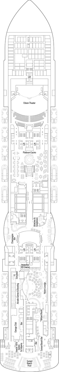- Yüzey alanı 49 m², balkon 17 m², güverte 11-14 m² - Kanepe ile oturma alanı veya ayrı oturma alanı - 2 yatak odası, biri çift kişilik yatak, diğeri ise iki tek kişilik yatak - Giyinme odası - İki banyo, biri küvetli, diğeri duşlu, saç kurutma makinesi bulunan makyaj alanları - İnteraktif TV, telefon, Wi-Fi bağlantısı (ücretli), kasa ve minibar - 5 kişiye kadar konaklama imkanı - Görsel sadece temsili olup, boyutlar, düzen ve mobilyalar değişiklik gösterebilir (aynı kabin kategorisi içinde).