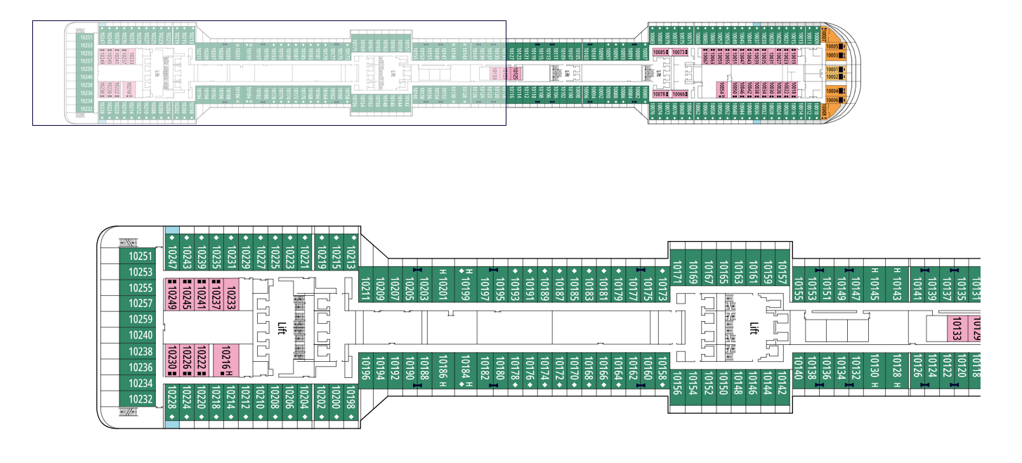 Yüzey yaklaşık 38-41 m², balkon yaklaşık 4-6 m², güverte 9-11 Oturma alanı ve kanepe Geniş dolap Banyoda küvet, saç kurutma makinesi ile makyaj alanı Rahat çift kişilik veya tek kişilik yataklar (isteğe bağlı) Etkileşimli TV, Wi-Fi bağlantısı (ücretli), telefon, kasa ve mini bar Görsel yalnızca temsili olup, boyut, düzen ve mobilyalar (aynı kabin kategorisinde) farklılık gösterebilir.