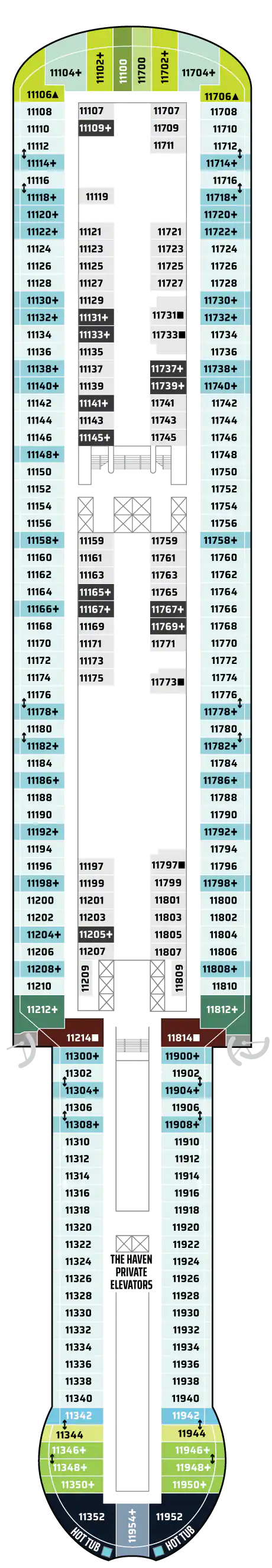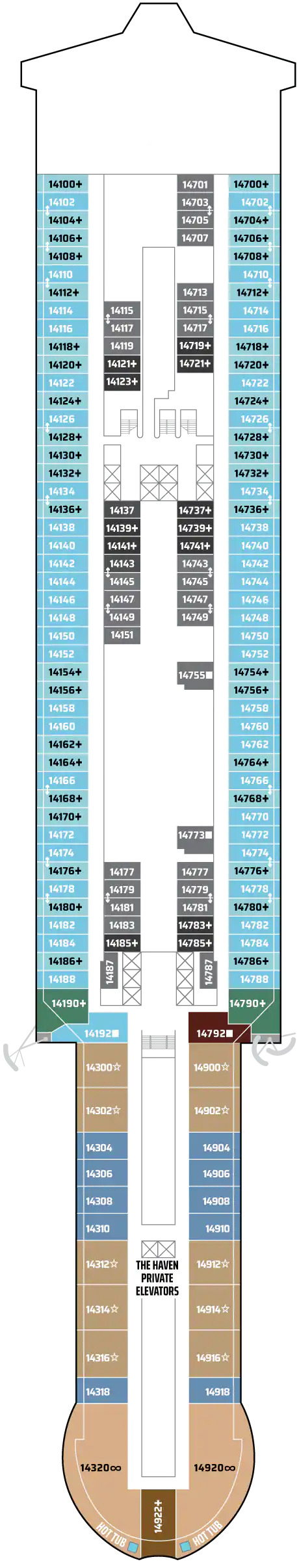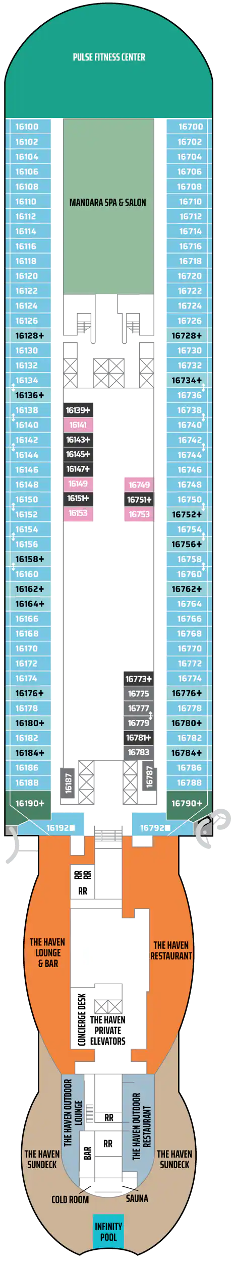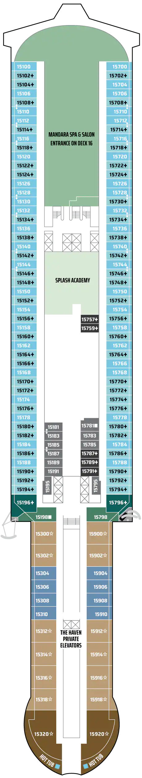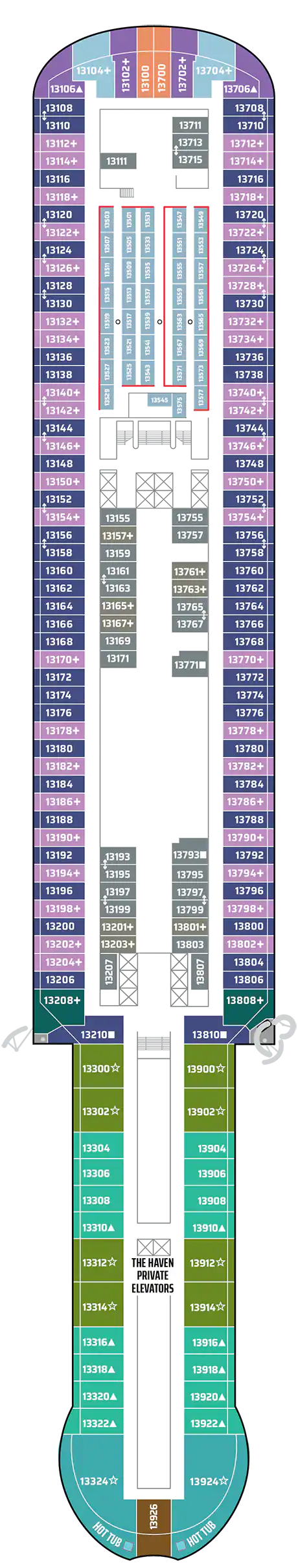 Bu lüks Penthouse'lar The Haven olanaklarına erişim sağlar ve bir kral yatak, bazılarında bir tane daha sığacak şekilde yatak takımı, jetli duşlu lüks banyo, oturma alanı ve muhteşem manzaraları hayranlıkla izleyebileceğiniz geniş bir balkon içerir. En üst düzey lüks tatil için uşak ve konsiyerj hizmeti dahildir. Kapasite: 2-3 Toplam Yaklaşık Boyut: 34-38 m 2 Balkon Ölçüsü: 7-12 m2 GÜVERTE(LER): 12, 13, 14, 15 KONUM: Orta, Kıç