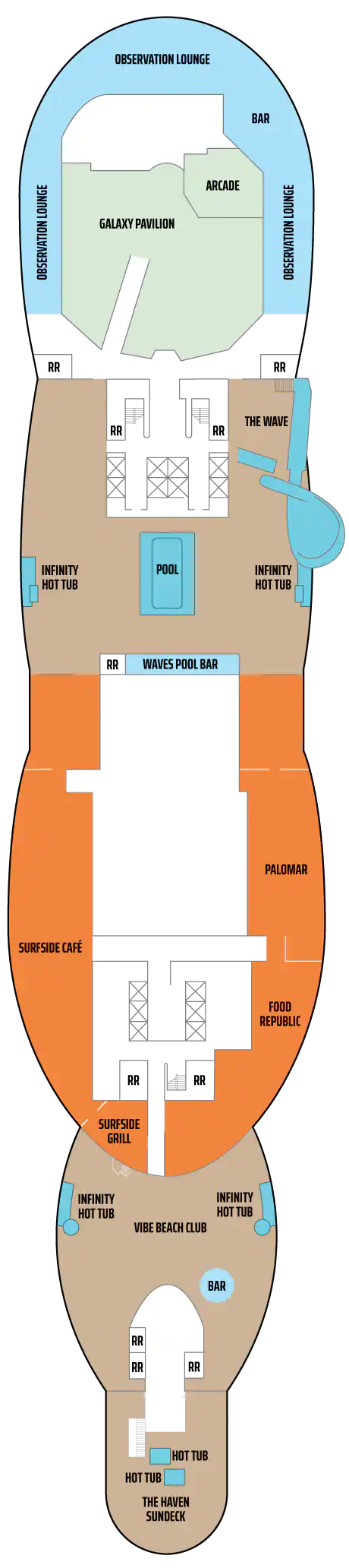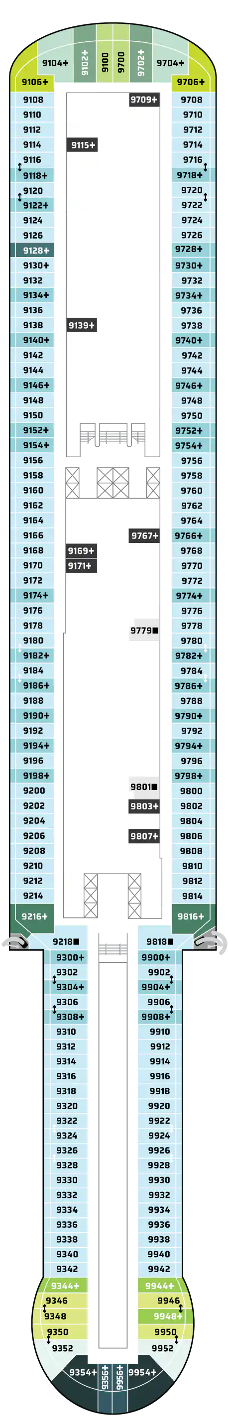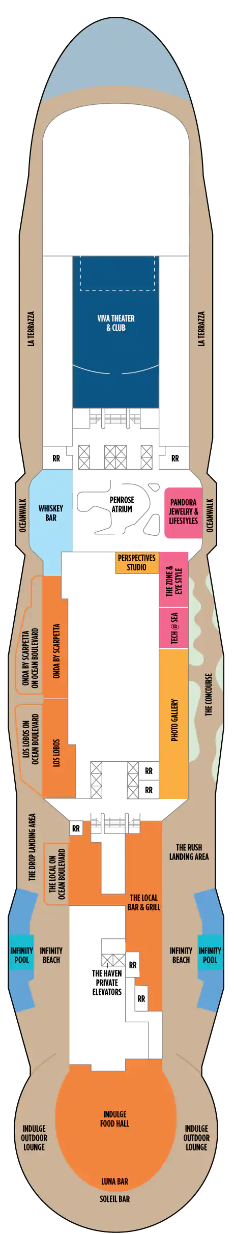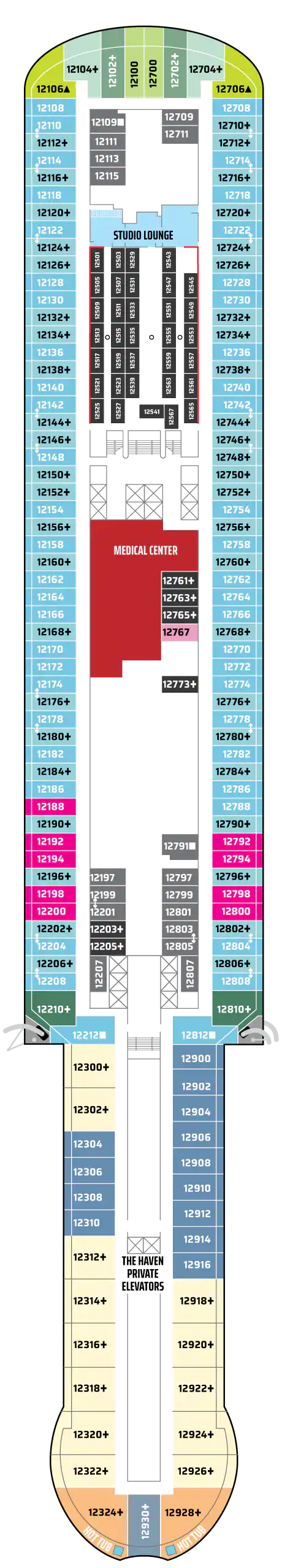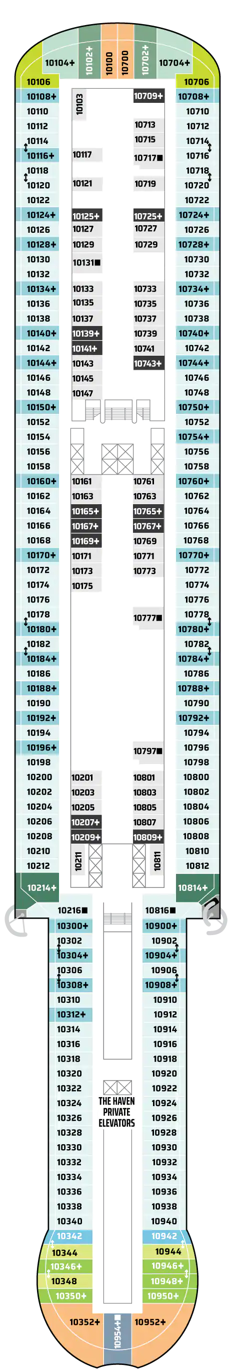 Bu lüks Penthouse'lar The Haven olanaklarına erişim sağlar ve bir kral yatak, bazılarında bir tane daha sığacak şekilde yatak takımı, jetli duşlu lüks banyo, oturma alanı ve muhteşem manzaraları hayranlıkla izleyebileceğiniz geniş bir balkon içerir. En üst düzey lüks tatil için uşak ve konsiyerj hizmeti dahildir. Kapasite: 2-3 Toplam Yaklaşık Boyut: 34-38 m 2 Balkon Ölçüsü: 7-12 m2 GÜVERTE(LER): 12, 13, 14, 15 KONUM: Orta, Kıç