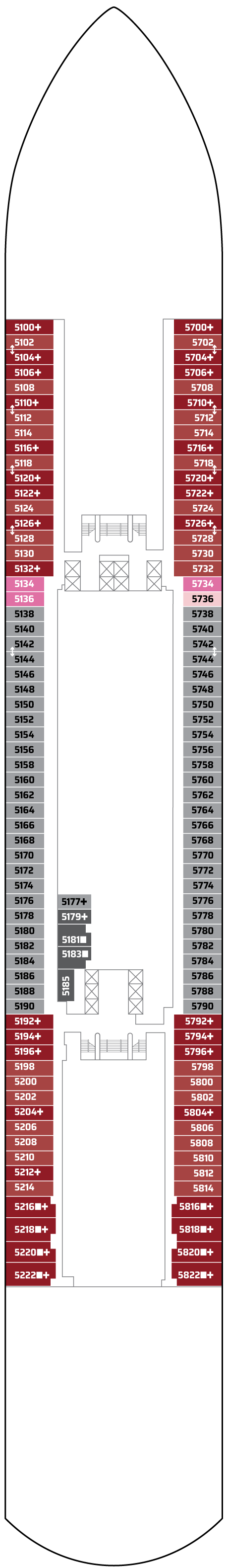 Aileler için mükemmel olan bu kamaralarda, bir kraliçe yatağa dönüştürülebilen iki alt yatak, iki kişiyi daha ağırlayabilen bir çift kişilik çekyat ve güzel manzaralar sunan bir pencere bulunur. Bazıları ayrıca daha fazla seçenek için diğer kamaralara bağlanabilir. Kapasite: 4 Toplam Yaklaşık Boyut: 21-34 m2 GÜVERTE(LER): 5 KONUM: Orta