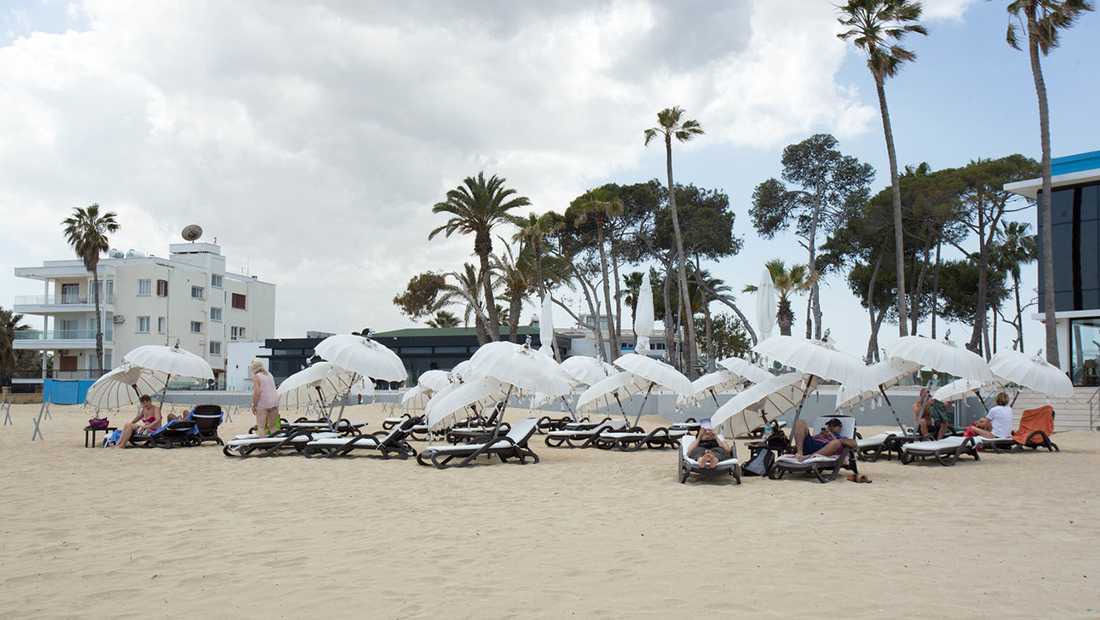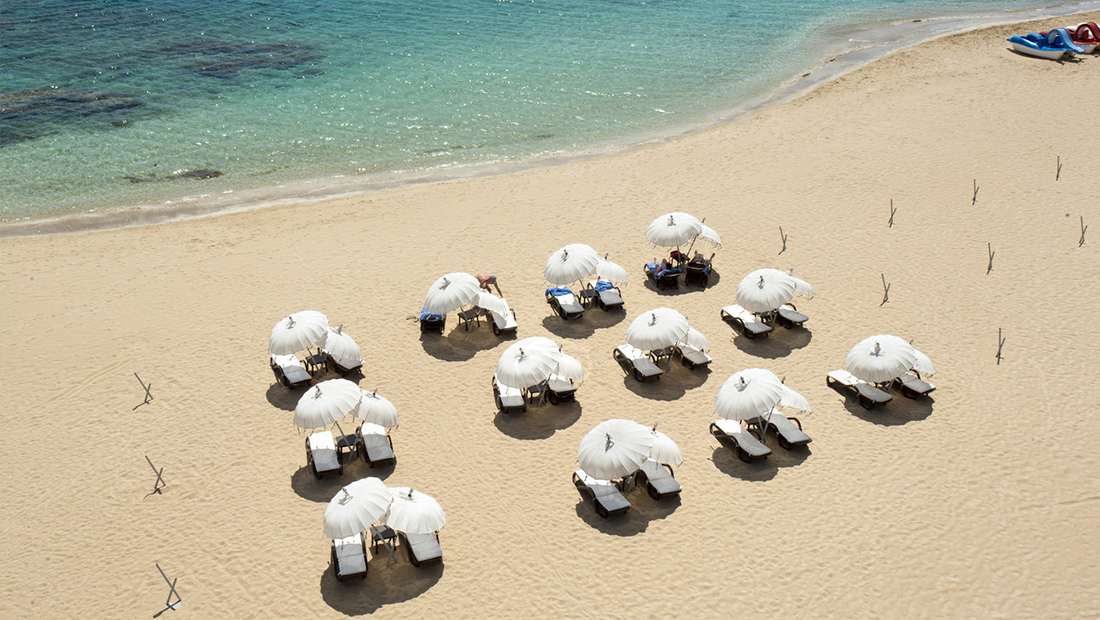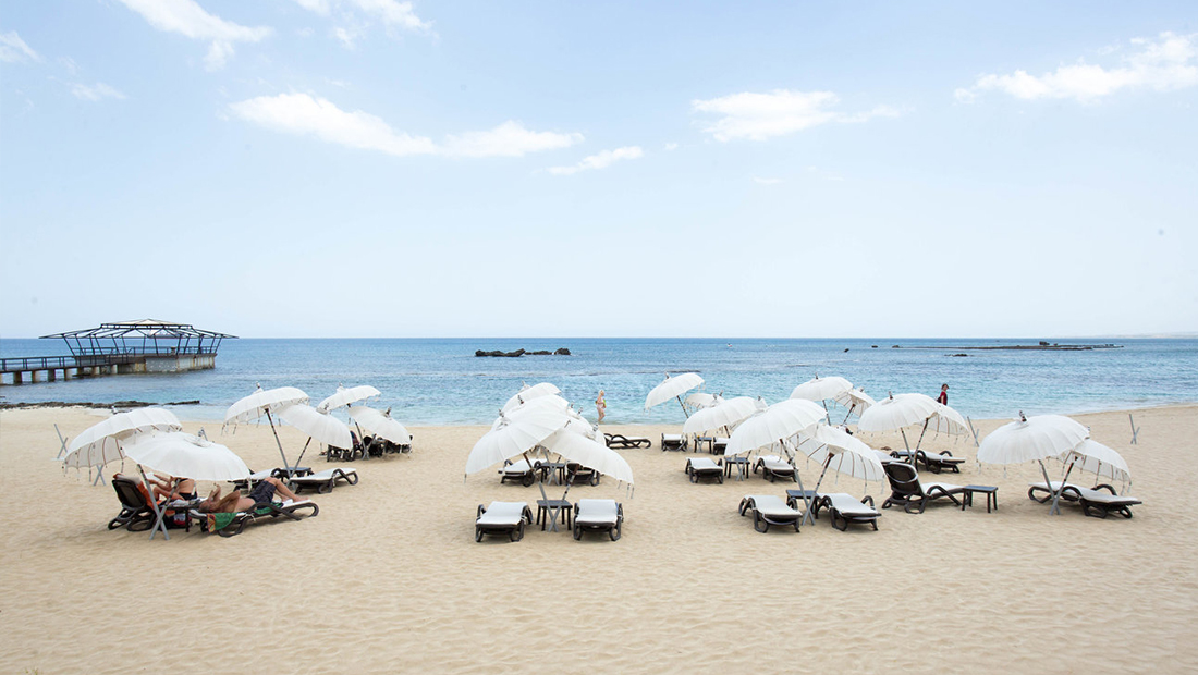 Plajda şezlong, minder, şemsiye ve havlu ücretsiz.